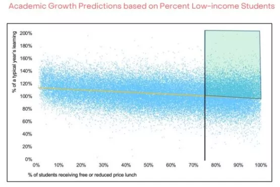 [In the figure below, academic growth is compared to the percent of students identified as low-income for all schools in the U.S. (blue dots). The horizontal yellow line is the best-fit line or the predicted growth. All schools above that line have higher growth rates than predicted. The top right quadrant shaded in green are examples of U.S. schools, including schools in Philadelphia, with student populations of 75% low-income or more and had actual growth above the predicted line. In this simplified regression model, these schools are considered beating the odds for students.]